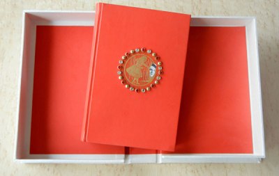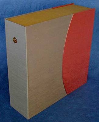Red leather binding with clam-shell book box.