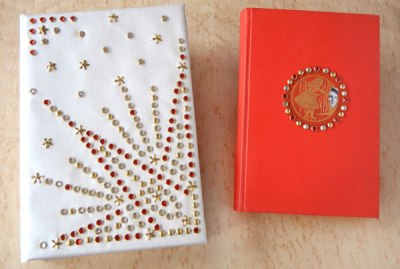 Detail shot of rhinestone and stud decoration on the cover of the clamshell box.